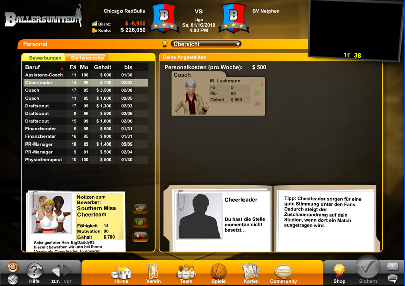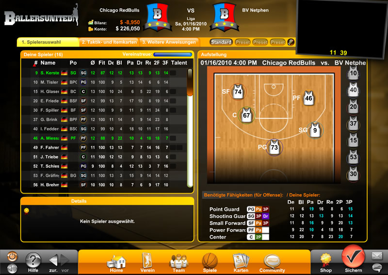 Ballersunited ist eine tolle Kombination aus fast real wirkendem Basketballmanagement und den allseits bekannten und beliebten Trading Card Games. Dieses Browserspiel ist so professionell gestaltet, das sich manch anders Spiel, das man in der Regel für viel Geld kaufen muss, dahinter verstecken kann. Und der riesen Vorteil, der sich hier bietet ist natürlich, das man Ballersunited völlig gratis spielen kann. Wer sich schon mal am ein oder anderen Manager Onlinespiel versucht hat wird dieses hier lieben, aber auch absolute Neulinge kommen hier voll auf ihre Kosten! Die Anmeldung ist denkbar einfach. Man klickt auf der Spielseite auf Anmelden, muss dort einige kurze Angaben machen und die AGB`s akzeptieren. Kurz nach Absenden der Daten bekommt man eine Bestätigungs-email, die man dann wiederum durch anklicken des darin enthaltenen Links bestätigt. Das dauert höchstens eine Minute. Direkt nach dieser Bestätigung erhält man eine zweite Mail, in Der der Account freigegeben wird, und in dieser Mail erfährt man auch, in welcher Liga man zukünftig spielt. Jetzt kann man sich einloggen, und das Spiel beginnt!Man spielt hier den Manager eines Basketball Vereins und hat somit die Verantwortung für alles, was das Team und die Spiele angeht. Soll heißen, man muss dafür Sorge tragen das die Spieler ordentlich trainiert werden. Hierbei zu Anfang nicht übertreiben, sonst sind die Spieler müde, bevor es richtig angefangen hat! Später im Spiel hat man sogar die Möglichkeit, einen Assistenztrainer einzustellen, und mancher wird froh über dessen Hilfe sein. Sicher ist es mit dem Training allein nicht getan, denn auch die richtige Mannschaftsaufstellung kann zu einer großen Herausforderung werden.