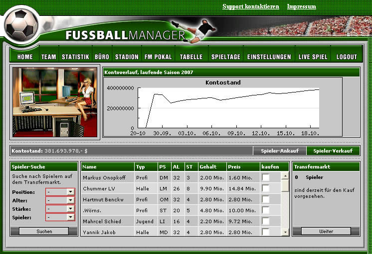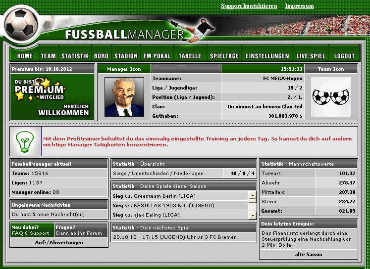 Browsergames wie dieses Spiel machen nicht nur Spaß, sondern fesseln so richtig an den Bildschirm. Fußballfans können an Tagen an denen keine Fußballspiele im Fernsehen stattfinden durch das Manager Browsergame ein tiefes und spannendes Erlebnis genießen und ihrem liebsten Hobby weiter nachgehen. Jeder Tag entscheidet aufs Neue über Sieg oder Niederlage, zu tun gibt es immer etwas um das eigene Team nach vorne zu bringen der die finanzielle Lage des Vereins zu verbessern. Da die zahlreiche Konkurrenz aber auch nicht schläft, entsteht ein fordernder und spannender Wettkampf.