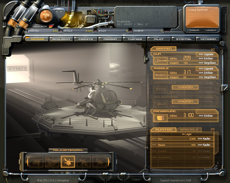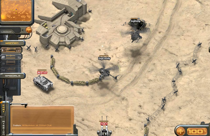 Das Action Browsergame Hellblades ist ein Multiplayer Onlinespiel, bei dem der Spieler seinen eigenen Hubschrauber auf einer 3D Echtzeit-Schlachtkarte steuert. Hellblades kann ohne zeitliche Einschränkung und vollkommen kostenlos gespielt werden. Es gibt auch einen Premium Account, der dem Premium-Spieler kleinere Vorteile gegenüber den kostenlosen Spielern bringt.Nachdem man sich beim Hubschrauber Browsergame Hellblades kostenlos registriert hat, lernt ein neuer Spieler im "Tutorial" wie er sich in diesem Hubschrauberspiel bewegen kann. Er erwirbt folgende Kenntnisse: Die Steuerung des Helikopters auf dem Trainingsgelände der Hellblades Corp. Die Navigation über längere Distanzen mit der so genannten "Minimap". Ebenso lernt der Spieler seine Magazine aufzufüllen, den Hubschrauber im Flug zu stoppen, Kraftfelder zu errichten und Hologramme zu erschaffen. Interessante Features sind die Reparatur-Druiden, der Turbulenzgenerator, das Tarnfeld, die Baby-Nuke und der Lufttransporter.