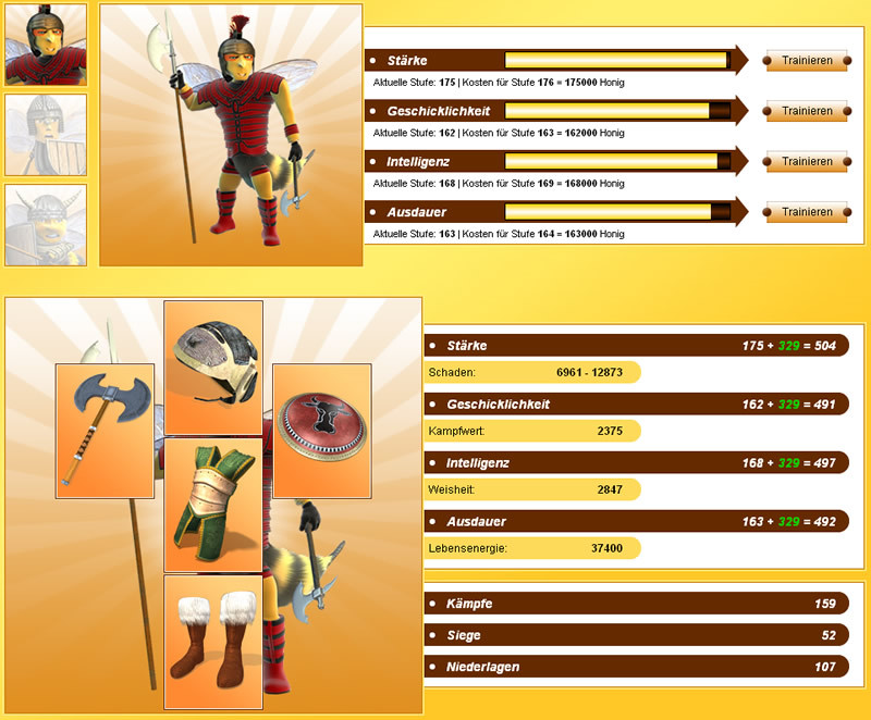 Auch musst du dich auf Kämpfe mit anderen Bienenvölkern einstellen. Entweder kämpfst du alleine gegen ein Bienenvolk, um so viel wie möglich von dem Honig zu bekommen oder Du schließt dich mit anderen Bienenvölkern zusammen und ihr kämpft gemeinsam. Bevor du dich auf den Kampf einlassen kannst, musst du deinen Helden natürlich gut ausbilden, um auch eine Chance bei einer Schlacht zu haben.